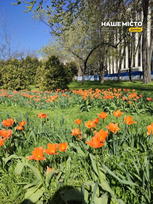 У самому серці Дніпра, у сквері Героїв, розцвів справжній весняний сад. Яскраві помаранчеві та червоні тюльпани масово розквітли на зелених газонах просто в центрі міста, перетворивши міську локацію на квіткову казку. Сонячні промені, м’яка зелень дерев і насичені барви квітів створюють неповторну атмосферу — ніби саме місто одягло весняне вбрання, передає «Наше місто».