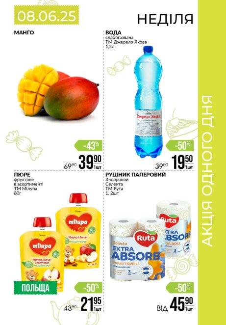 8 червня — день товарів для всієї родини. М’які тришарові рушники Ruta, фруктові пюре Milupa для малюків, вода «Джерело Якова» та соковите манго — все зі знижкою до -50%. Субота — ідеальний день поповнити запаси корисного.