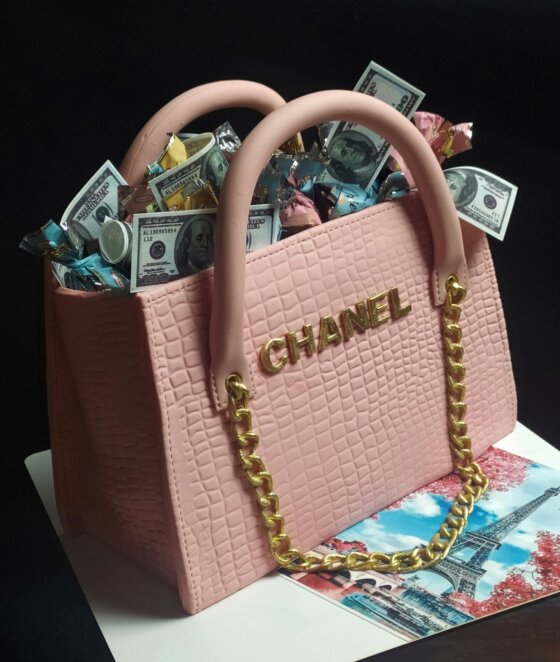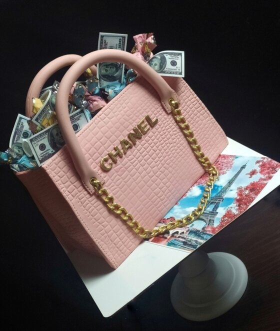 На вигляд це — вишукана рожево-пудрова сумочка з тисненням під шкіру та золотим ланцюжком, а насправді — багатошаровий торт вагою 4 кілограми. Верхівку «сумки» прикрашають реалістичні їстівні купюри в американській валюті та цукерки в блискучих обгортках. Кожна деталь десерта — від ручок до логотипа — виготовлена з їстівних матеріалів і відтворена з вражаючою точністю.