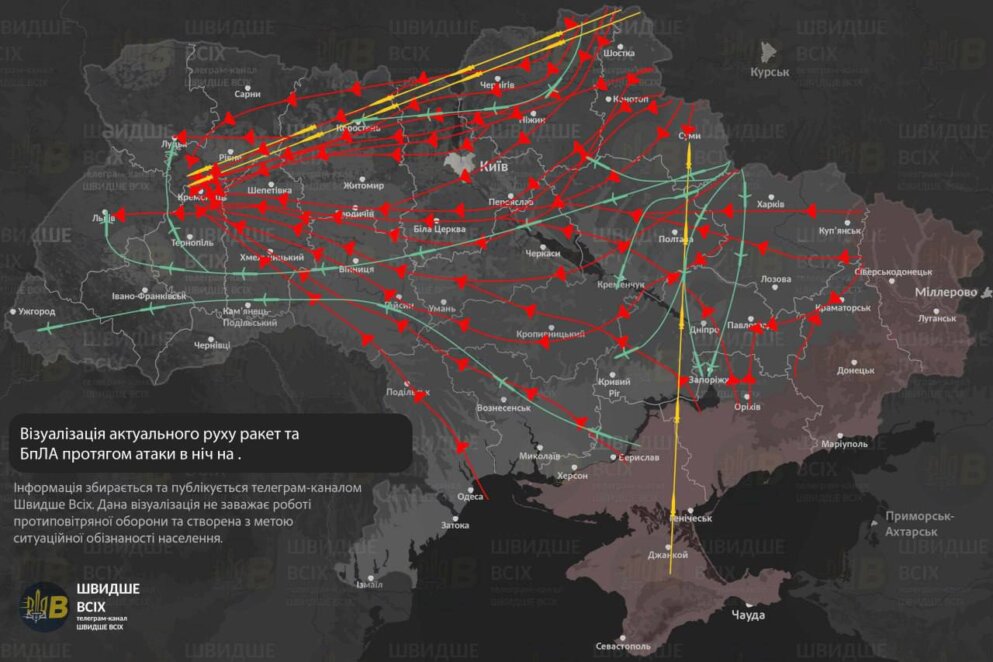 За даними Повітряних сил, кілька груп ракет попрямували на Кіровоградщину, Полтавщину та Дніпропетровщину. Інші — через північ Київщини вийшли на Житомирщину, ще частина — через Черкащину на захід.