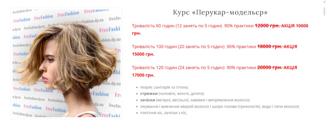Такі програми зазвичай тривають від кількох тижнів. Головний акцент – практика: робота з жіночими та чоловічими стрижками різних видів та стилів, колористика, фарбування, укладання, створення різноманітних зачісок, робота з проблемами волосся тощо.
