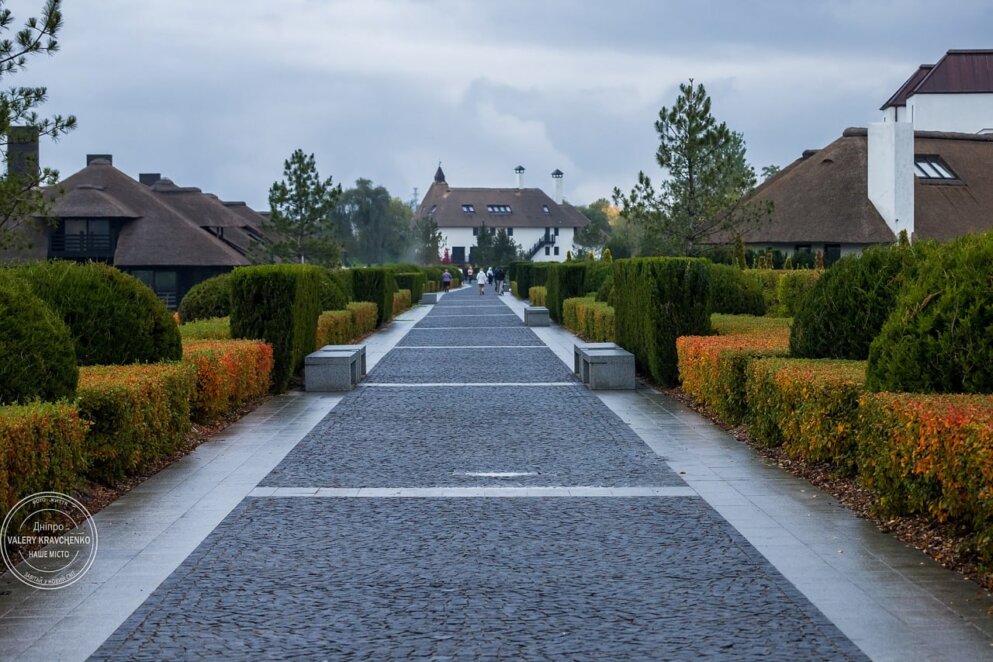Особливо вражають кущі з яскравим помаранчево-червоним листям та золотисті грона ягід, що прикрашають зелені насадження. Ландшафтні композиції з конусоподібними туями та охайно підстриженими живоплотами гармонійно доповнюють природну красу.
