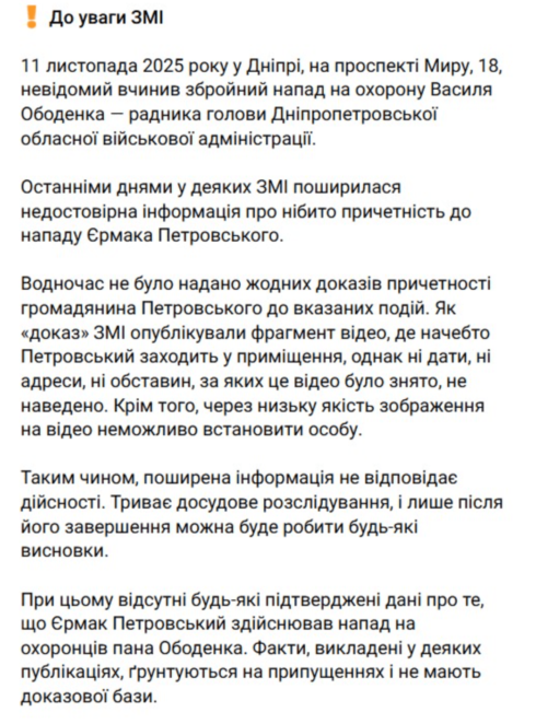 В одному з Телеграм-каналів з’явилось повідомлення про непричетність сина Олександра Петровського, також відомого як «Нарік», Єрмака до збройного нападу на охоронця радника т.в.о. голови ДніпроОВА. У повідомленні також йдеться про можливі судові позови проти медіа, які висвітлювали подію. Правоохоронці досі не надали офіційних коментарів, інформує “Дніпро Оперативний”.