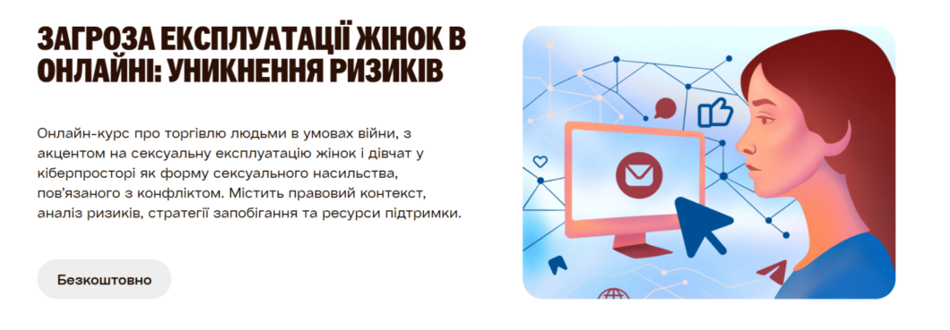 “Онлайн-курс – про торгівлю людьми в умовах війни, з акцентом на сексуальну експлуатацію жінок і дівчат у кіберпросторі як форму сексуального насильства, пов’язаного з конфліктом, – зазначається в описі курсу на платформі Prometheus. – Містить правовий контекст, аналіз ризиків, стратегії запобігання та ресурси підтримки”.