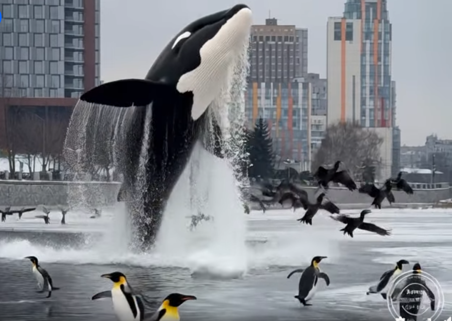 Або ж на вкритій кригою поверхні річки Дніпро – безліч антарктичних пінгвінів. А ось поруч із ними з ополонки вистрибує величезна косатка.