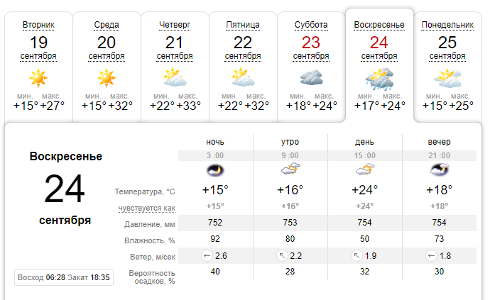 Однако уже в субботу жителям города лучше перестраховаться и, выходя на улицу, взять с собой зонт. На выходные ожидается ухудшение погодных условий. В субботу температура воздуха составит 18-22 °C, с порывами ветра 4-6 м/с; в воскресенье – 16-24 м/с, со скорость ветра в 2 м/с.