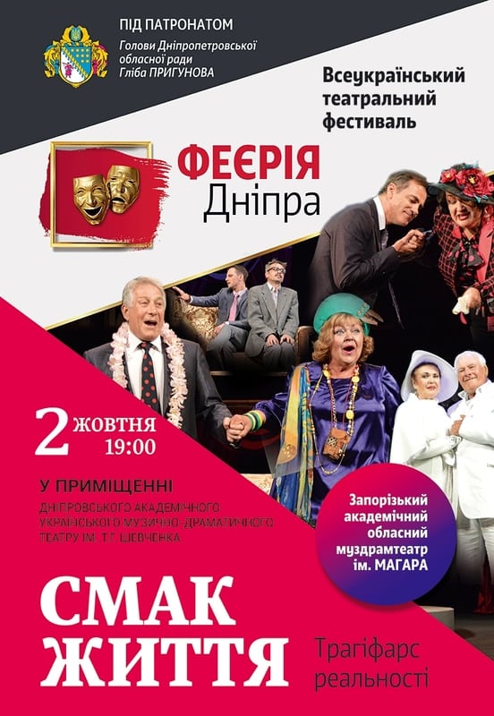 Запорожский академический украинский музыкально-драматический театр им В.Г. Магара в рамках театрального фестиваля «Феерия Днепра» представляет трагифарс реальности «Вкус жизни». Достаточно часть случается, что мы самостоятельно ломаем свою жизнь, пряча ее под завалами обыденности. Перестаем ценить мгновения и наслаждаться простыми вещами. Мы теряем счастье вечерних прогулок, от которых захватывает дух. Счастье искренних улыбок. Счастье общения с родными и близкими. Мы теряем вкус жизни, который больше не можем почувствовать. Именно поэтому так важно понять уже сейчас, что наша жизнь бесценна и неимоверна. И вместе с тем скоротечна. «Вкус жизни» — это подарок от корифеев театра, которые умеют ценить жизнь и радоваться неповторимым моментам.
