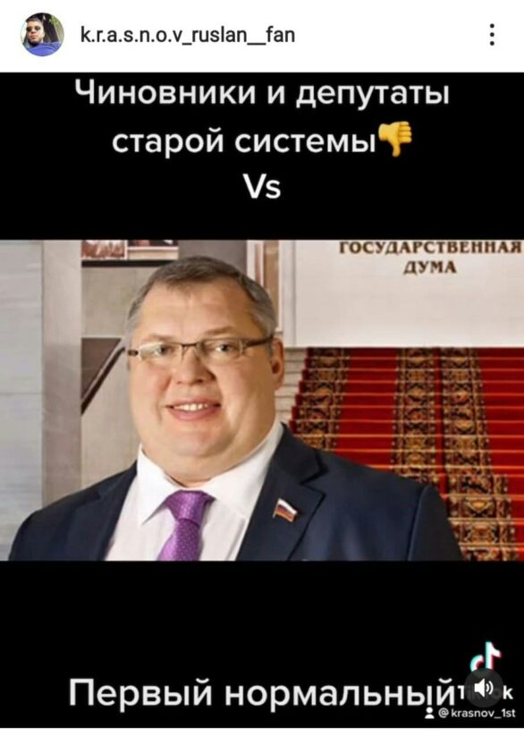 Почитатели депутата Днепропетровского облсовета Руслана Краснова, видимо, решив сделать своему идолу приятное, сравнили его с коллегами из Госдумы Российской Федерации. Соответствующие мэмы были размещены в фан-аккаунте Руслана Краснова в Instagram, сообщает 49000.com.ua. В ролике сына одиозного Загида Краснова сравнили себя с чиновниками и депутатами «старой системы», непрозрачно намекнув на то, что он «первый нормальный депутат».