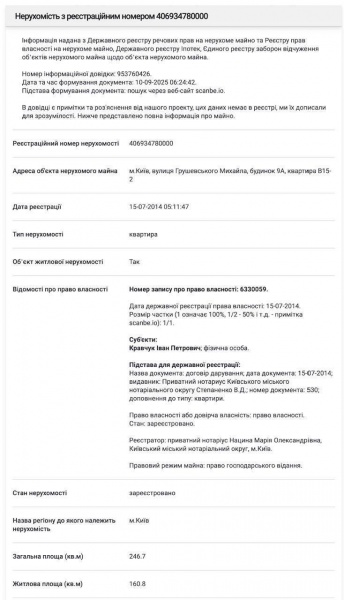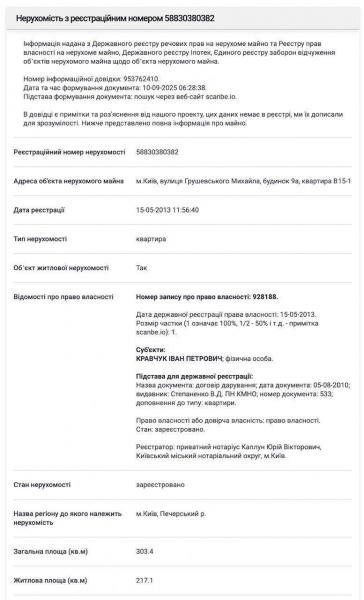 По данным реестра недвижимости, Иван Кравчук владеет тремя квартирами в доме по адресу Грушевского, 9 а: квартирой В15-2 площадью 246 кв. м, В15-1 площадью 303 кв. м и В6-2 площадью 247 кв. м, а также пятью парковочными местами. Всего на Кравчука зарегистрировано 78 объектов недвижимости, включая 38 земельных участков, 14 объектов коммерческой недвижимости, 9 квартир, 11 домов и 6 парковочных мест.