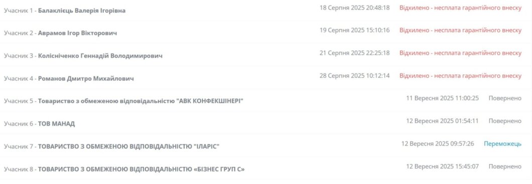 Согласно протоколу проведения торгов, в последние минуты аукциона «ИЛАРИС» предложила стартовую цену за фабрику — 50 млн 004 тыс. грн. Это была наибольшая ставка, поэтому другим участникам вернули гарантийные взносы.