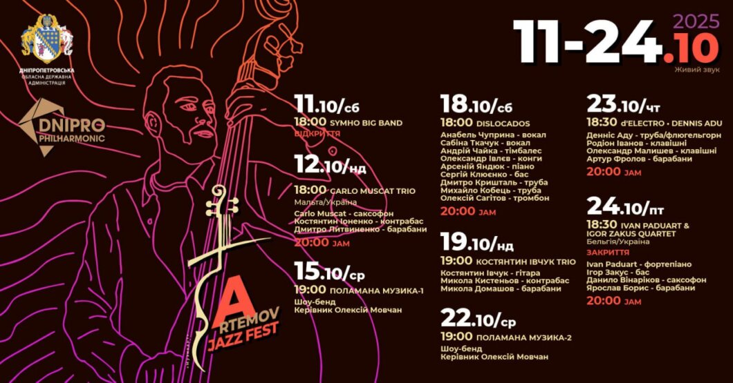 В этом году ARTEMOV Jazz Festival начнется грандиозным музыкальным событием — проектом SYMPHO BIG BAND, который объединит два мощных творческих коллектива: Академический симфонический оркестр Днепропетровской филармонии и DNIPRO BIG BAND. Этот уникальный симбиоз классики и джаза соединит академическую величественность симфонического звучания с непринужденной энергией джазовой импровизации. На сцене встретятся два мира — гармония оркестровой традиции и свобода биг-бенда. Результат обещает быть впечатляющим: масштабное, многослойное звучание, которое подарит слушателям настоящую феерию эмоций. Открытие фестиваля станет настоящим праздником джаза, где каждый аккорд будет звучать как дыхание живой энергии города. Концерт состоится 11 октября в 18:00 в большом зале филармонии.